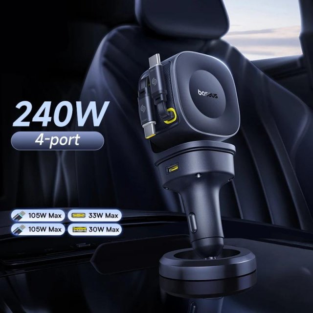 240W 4-Port Fast Car Charger with Retractable Cable and USB Type-C Ports