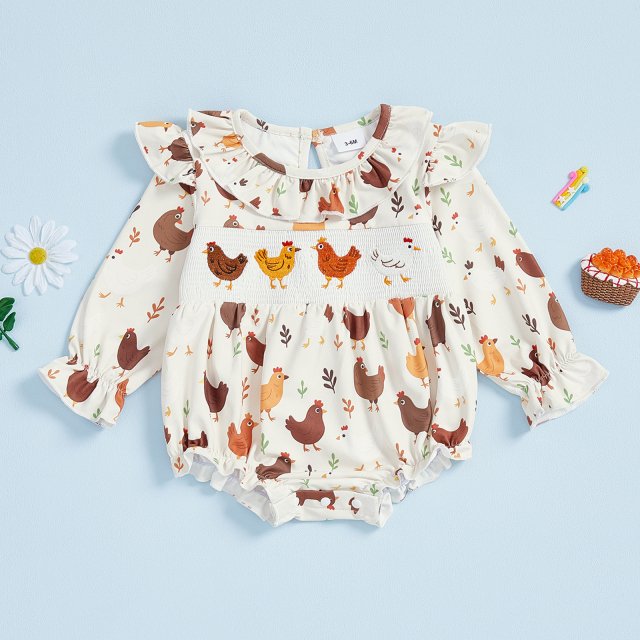 Baby Girl Autumn Ruffled Romper with Chicken Embroidery – 0-18M