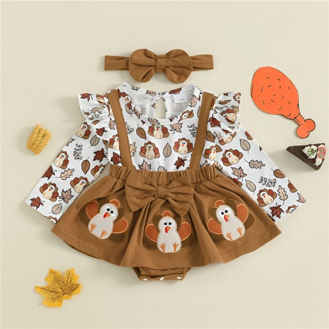 Baby Girl Thanksgiving Romper with Turkey Embroidery & Headband Set