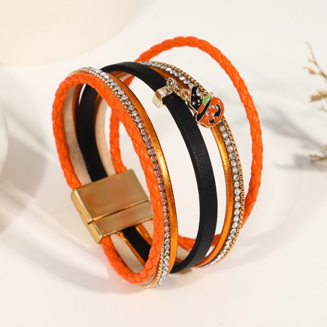 Embrace the spirit of the season with this stunning Boho Leather Wrap Bracelet, featuring playful pumpkin charms and sparkling crystal chains. Designed for women who love unique, expressive accessories, this bracelet perfectly blends Halloween charm with timeless bohemian elegance. Crafted from soft PU leather and durable alloy, it wraps comfortably around your wrist for a stylish, layered look that’s both chic and festive.