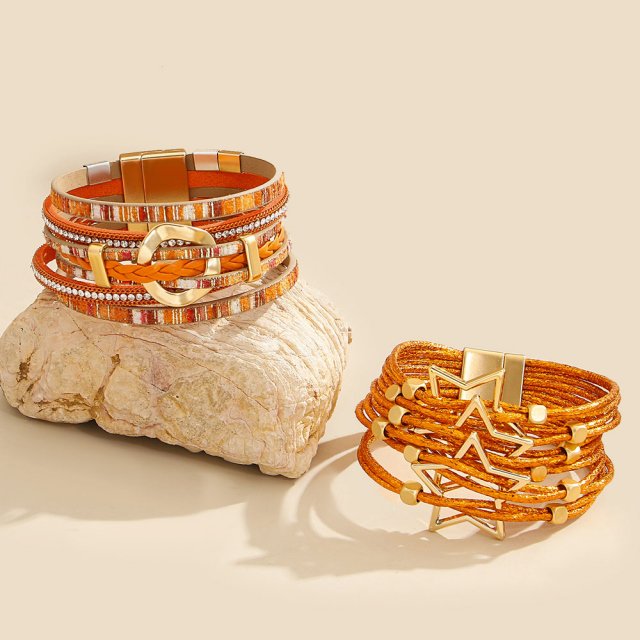Boho Orange Braided Leather Bracelet for Women