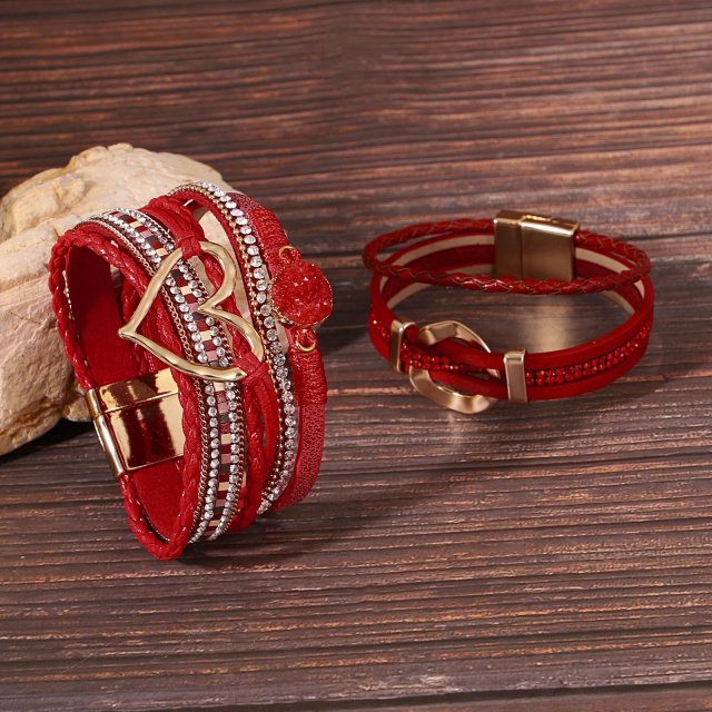 Elegant Red Heart Leather Bracelet with Rhinestone Charm