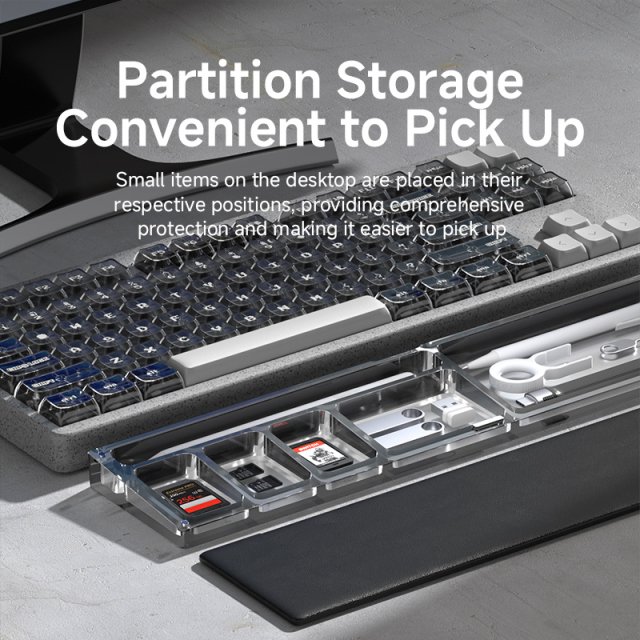 Every detail is crafted to enhance your desk experience. The black translucent acrylic base adds a touch of sophistication while subtly revealing stored essentials. Its zoned storage compartments keep stationery, cards, and small tools neatly in place, offering quick access and a clutter-free surface. With magnetic retention, your cards and accessories stay secure, even during intense typing sessions.