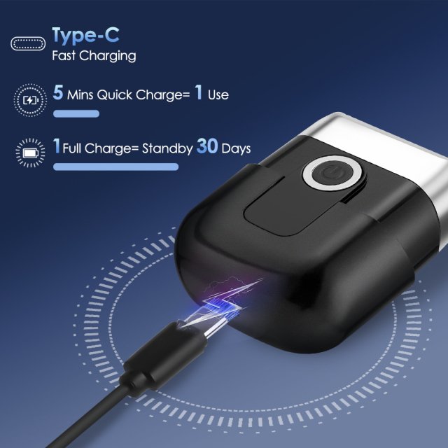 • Fast Charging: 5 minutes = 1 shave; lasts up to 30 days per full charge.