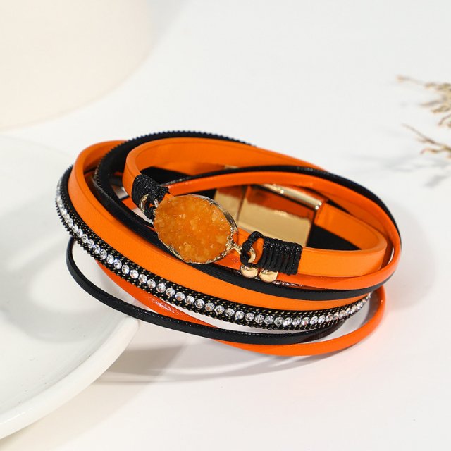 This stunning piece features multiple layers of soft, high-quality PU leather for a comfortable yet secure fit. Each wrap is beautifully detailed with alloy leaf charms and rhinestone accents, giving it a bohemian, vintage-inspired feel. The bright orange tones and pumpkin design make it the perfect accessory for Halloween and autumn-inspired outfits. With its magnetic clasp, the bracelet is easy to wear and remove, offering both convenience and elegance in one piece.